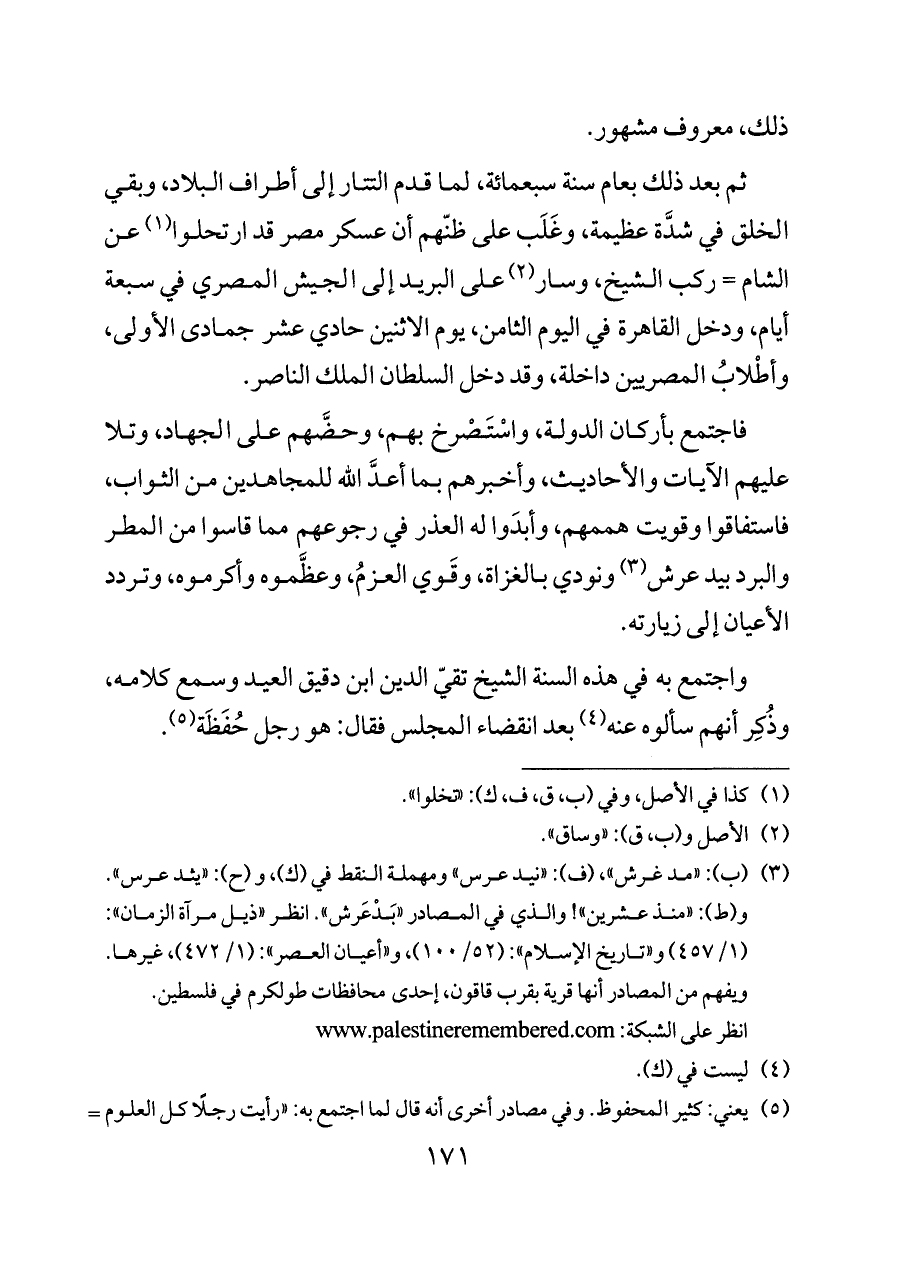 (¬٣) (ب): «مد غرش»، (ف): «نيد عرس» ومهملة النقط في (ك)، و (ح): «يثد عرس». و (ط): «منذ عشرين»! والذي في المصادر «بَدْعَرش». انظر «ذيل مرآة الزمان»: (١/ ٤٥٧) و «تاريخ الإسلام»: (٥٢/ ١٠٠)، و «أعيان العصر»: (١/ ٤٧٢)، غيرها. ويفهم من المصادر أنها قرية بقرب قاقون، إحدى محافظات طولكرم في فلسطين.