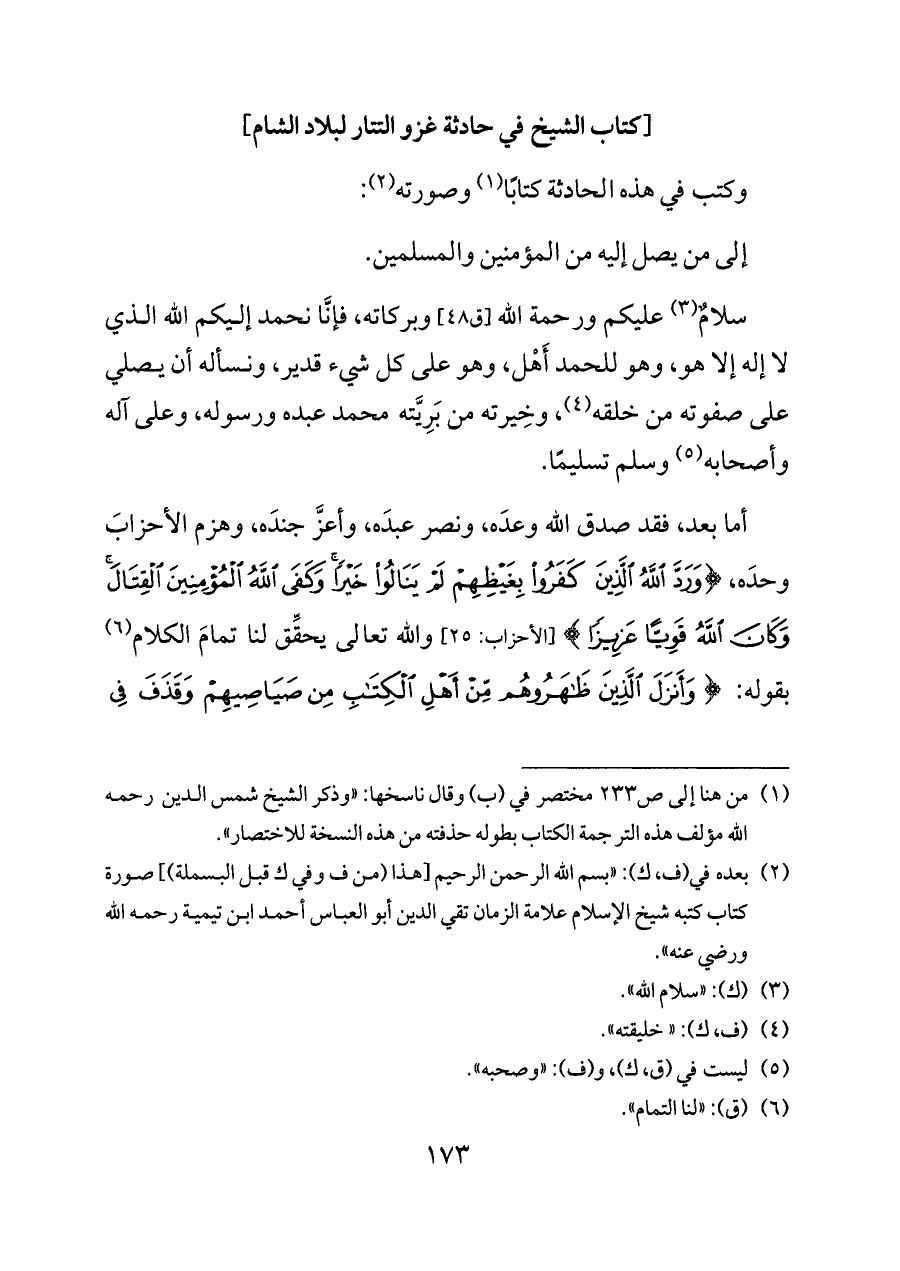 (¬٢) بعده في (ف، ك): «بسم الله الرحمن الرحيم [هذا (من ف وفي ك قبل البسملة)] صورة كتاب كتبه شيخ الإسلام علامة الزمان تقي الدين أبو العباس أحمد ابن تيمية رحمه الله ورضي عنه».