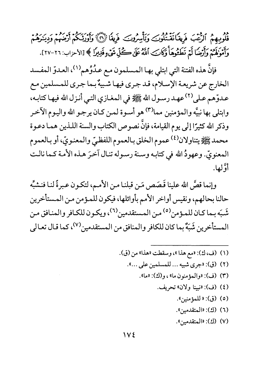 فإنَّ هذه الفتنة التي ابتلي بها المسلمون مع عدُوِّهم (¬١)، العدوّ المفسد الخارج عن شريعة الإسلام، قد جرى فيها شبيهٌ بما جرى للمسلمين مع عدوّهم على (¬٢) عهد رسول الله - صلى الله عليه وسلم - في المغازي التي أنزل الله فيها كتابه، وابتلى بها نبيَّه والمؤمنين مما (¬٣) هو أسوة لمن كان يرجو الله واليوم الآخر وذكر الله كثيرًا إلى يوم القيامة، فإنَّ نصوص الكتاب والسنة اللذين هما دعوة محمد - صلى الله عليه وسلم - يتناولان (¬٤) عموم الخلق بالعموم اللفظيّ والمعنويّ، أو بالعموم المعنويّ. وعهودُ الله في كتابه وسنة رسوله تنال آخرَ هذه الأمة كما نالت أوَّلها.