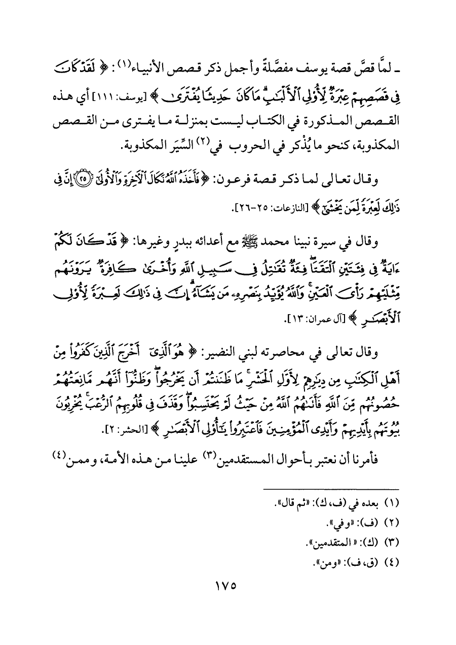 وقال في سيرة نبينا محمد - صلى الله عليه وسلم - مع أعدائه ببدرٍ وغيرها: {قَدْ كَانَ لَكُمْ آيَةٌ فِي فِئَتَيْنِ الْتَقَتَا فِئَةٌ تُقَاتِلُ فِي سَبِيلِ اللَّهِ وَأُخْرَى كَافِرَةٌ يَرَوْنَهُمْ مِثْلَيْهِمْ رَأْيَ الْعَيْنِ وَاللَّهُ يُؤَيِّدُ بِنَصْرِهِ مَنْ يَشَاءُ إِنَّ فِي ذَلِكَ لَعِبْرَةً لِأُولِي الْأَبْصَارِ} [آل عمران: ١٣].