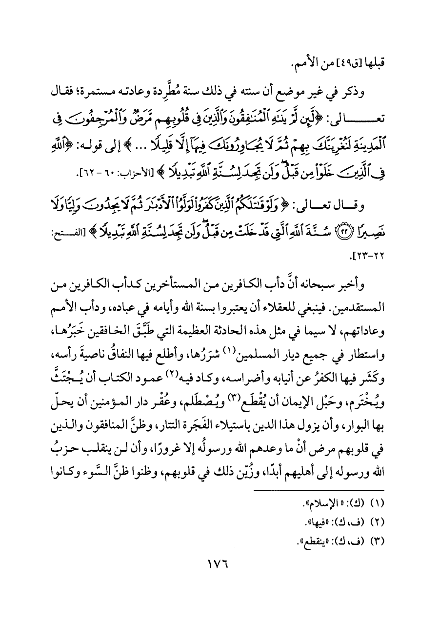 وذكر في غير موضع أن سنته في ذلك سنة مُطَّرِدة وعادته مستمرة؛ فقال تعالى: {لَئِنْ لَمْ يَنْتَهِ الْمُنَافِقُونَ وَالَّذِينَ فِي قُلُوبِهِمْ مَرَضٌ وَالْمُرْجِفُونَ فِي الْمَدِينَةِ لَنُغْرِيَنَّكَ بِهِمْ ثُمَّ لَا يُجَاوِرُونَكَ فِيهَا إِلَّا قَلِيلًا ... } إلى قوله: {اللَّهِ فِي الَّذِينَ خَلَوْا مِنْ قَبْلُ وَلَنْ تَجِدَ لِسُنَّةِ اللَّهِ تَبْدِيلًا} [الأحزاب: ٦٠ - ٦٢].