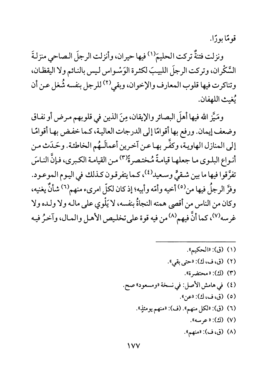 ومَيَّز الله فيها أهلَ البصائر والإيقان، مِنَ الذين في قلوبهم مرض أو نفاق وضعف إيمان. ورفع بها أقوامًا إلى الدرجات العالية، كما خفض بها أقوامًا إلى المنازل الهاوية، وكفَّر بها عن آخرين أعمالَهُم الخاطئة. وحَدَث من أنواع البلوى ما جعلها قيامةً مُختصرةً (¬٣) من القيامة الكبرى، فإنَّ الناسَ تفرَّقوا فيها ما بين شقيٍّ وسعيد (¬٤)، كما يتفرقون كذلك في اليوم الموعود. وفرَّ الرجلُ فيها من (¬٥) أخيه وأمّه وأبيه؛ إذ كان لكلّ امرئ منهم (¬٦) شأنٌ يغنيه، وكان من الناس من أقصى همته النجاةُ بنفسه، لا يَلْوي على ماله ولا ولده ولا غرسه (¬٧)، كما أنَّ فيهم (¬٨) من فيه قوة على تخليص الأهل والمال، وآخرُ فيه