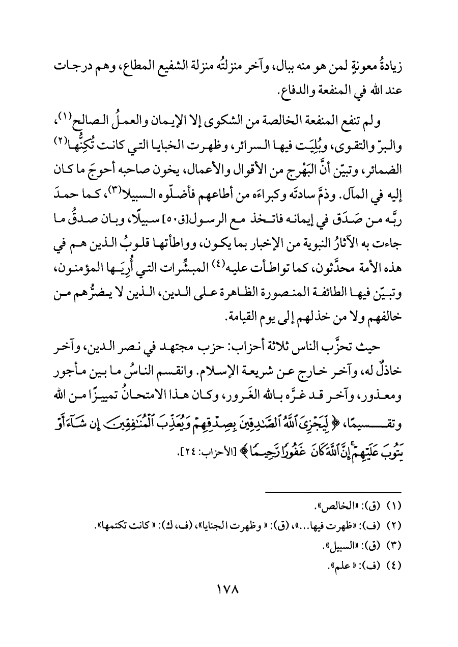 ولم تنفع المنفعة الخالصة من الشكوى إلا الإيمان والعملُ الصالح (¬١)، والبرّ والتقوى، وبُلِيَت فيها السرائر، وظهرت الخبايا التي كانت تُكِنُّها (¬٢) الضمائر، وتبيّن أنَّ البَهْرج من الأقوال والأعمال، يخون صاحبه أحوجَ ما كان إليه في المآل. وذمَّ سادتَه وكبراءَه من أطاعهم فأضلّوه السبيلا (¬٣)، كما حمدَ ربَّه من صَدَق في إيمانه فاتخذ مع الرسول [ق ٥٠] سبيلًا، وبان صدقُ ما جاءت به الآثارُ النبوية من الإخبار بما يكون، وواطأتها قلوبُ الذين هم في هذه الأمة محدَّثون، كما تواطأت عليه (¬٤) المبشِّرات التي أُرِيَها المؤمنون، وتبيّن فيها الطائفة المنصورة الظاهرة على الدين، الذين لا يضرُّهم من خالفهم ولا من خذلهم إلى يوم القيامة.