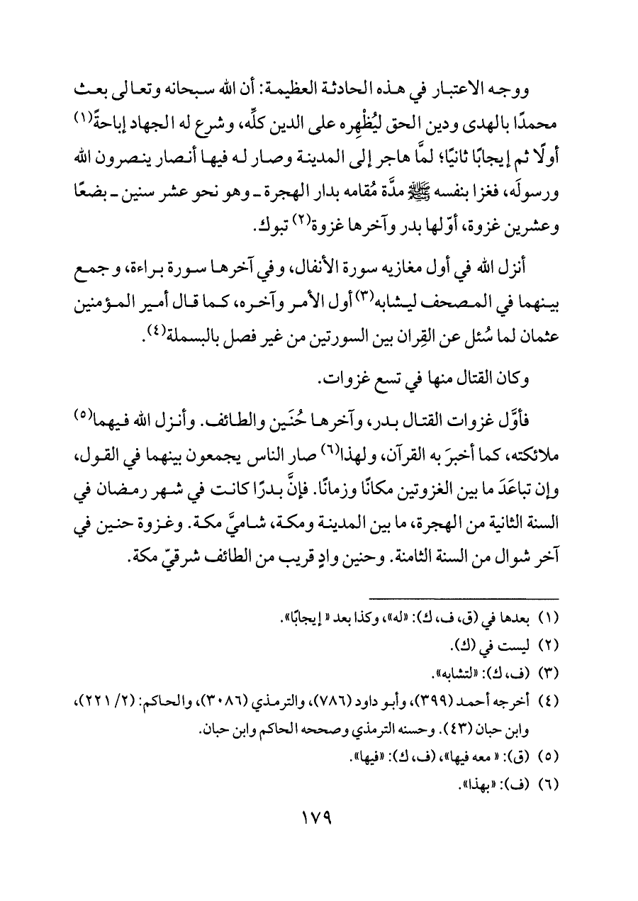 ووجه الاعتبار في هذه الحادثة العظيمة: أن الله سبحانه وتعالى بعث محمدًا بالهدى ودين الحق ليُظْهِره على الدين كلِّه، وشرع له الجهاد إباحةً (¬١) أولًا ثم إيجابًا ثانيًا؛ لمَّا هاجر إلى المدينة وصار له فيها أنصار ينصرون الله ورسولَه، فغزا بنفسه - صلى الله عليه وسلم - مدَّة مُقامه بدار الهجرة ــ وهو نحو عشر سنين ــ بضعًا وعشرين غزوة، أوّلها بدر وآخرها غزوة (¬٢) تبوك.