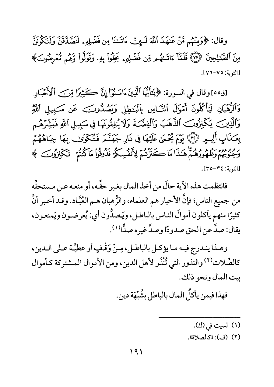 وهذا يندرج فيه ما يؤكل بالباطل، مِنْ وَقْفٍ أو عطيَّة على الدين، كالصِّلات (¬٢) والنذور التي تُنْذَر لأهل الدين، ومن الأموال المشتركة كأموال بيت المال ونحو ذلك.