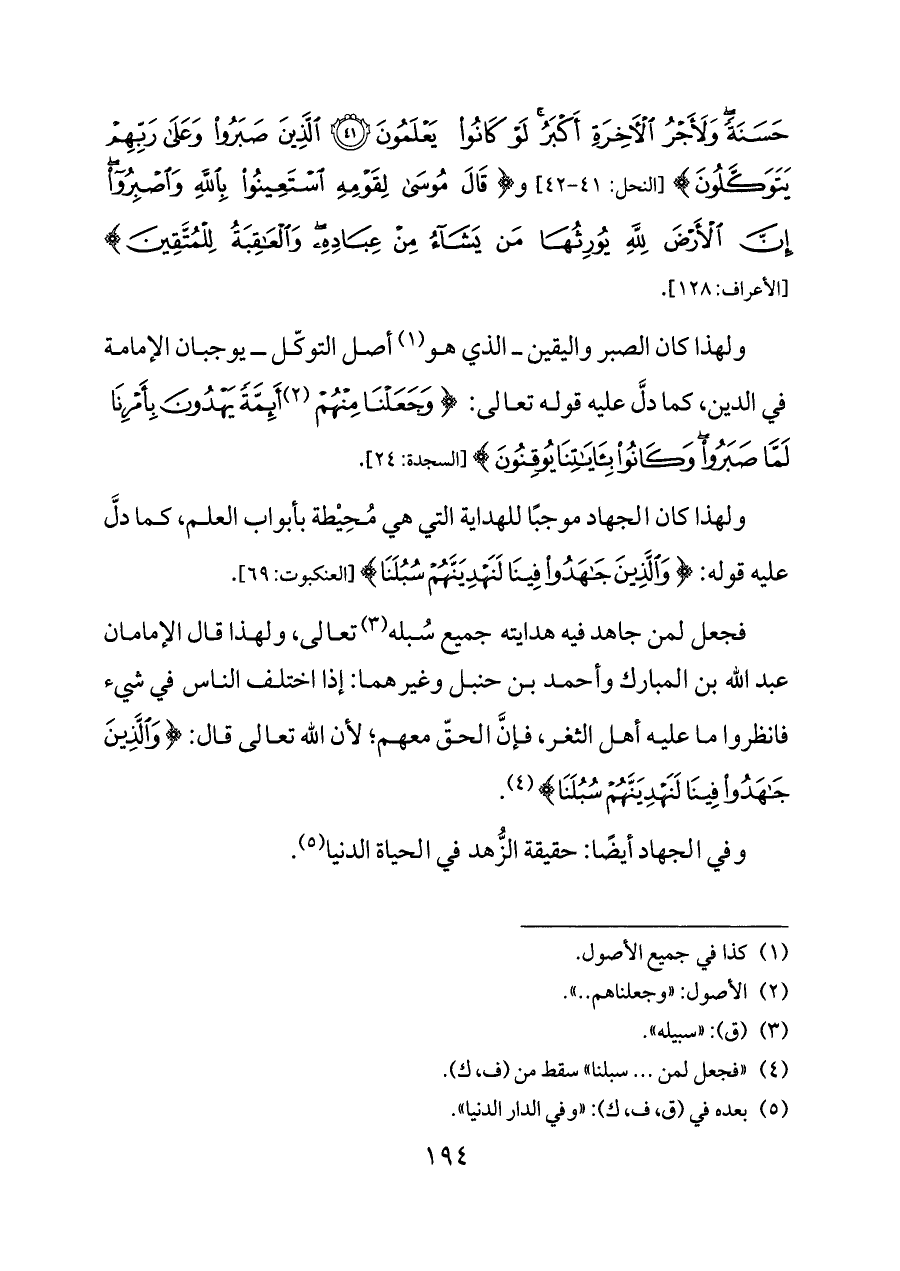 ولهذا كان الجهاد موجبًا للهداية التي هي مُحِيْطة بأبواب العلم، كما دلَّ عليه قوله: {وَالَّذِينَ جَاهَدُوا فِينَا لَنَهْدِيَنَّهُمْ سُبُلَنَا} [العنكبوت: ٦٩].