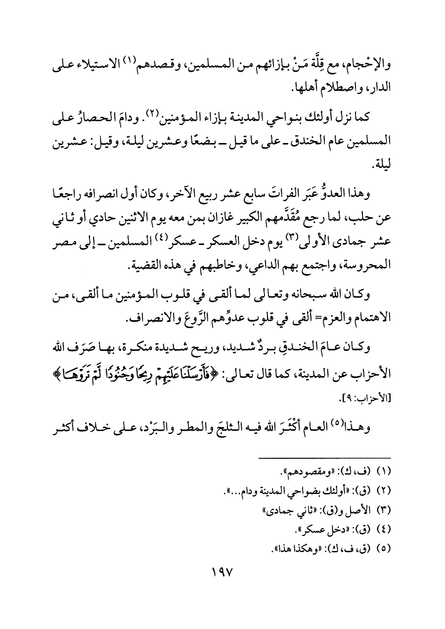 كما نزل أولئك بنواحي المدينة بإزاء المؤمنين (¬٢). ودامَ الحصارُ على المسلمين عام الخندق ــ على ما قيل ــ بضعًا وعشرين ليلة، وقيل: عشرين ليلة.