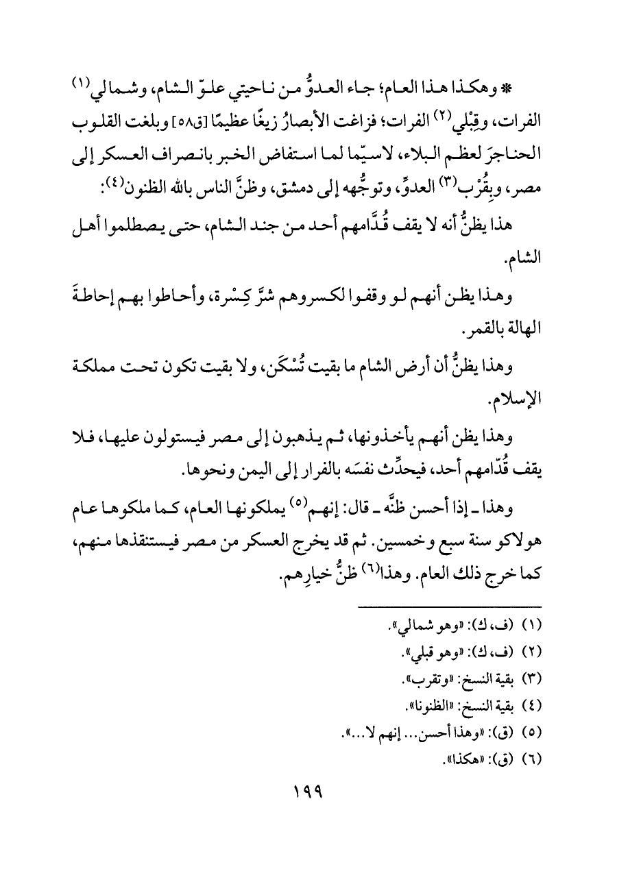 * وهكذا هذا العام؛ جاء العدوُّ من ناحيتي علوّ الشام، وشمالي (¬١) الفرات، وقِبْلي (¬٢) الفرات؛ فزاغت الأبصارُ زيغًا عظيمًا [ق ٥٨] وبلغت القلوب الحناجرَ لعظم البلاء، لاسيّما لما استفاض الخبر بانصراف العسكر إلى مصر، وبِقُرْب (¬٣) العدوِّ، وتوجُّهه إلى دمشق، وظنَّ الناس بالله الظنون (¬٤):