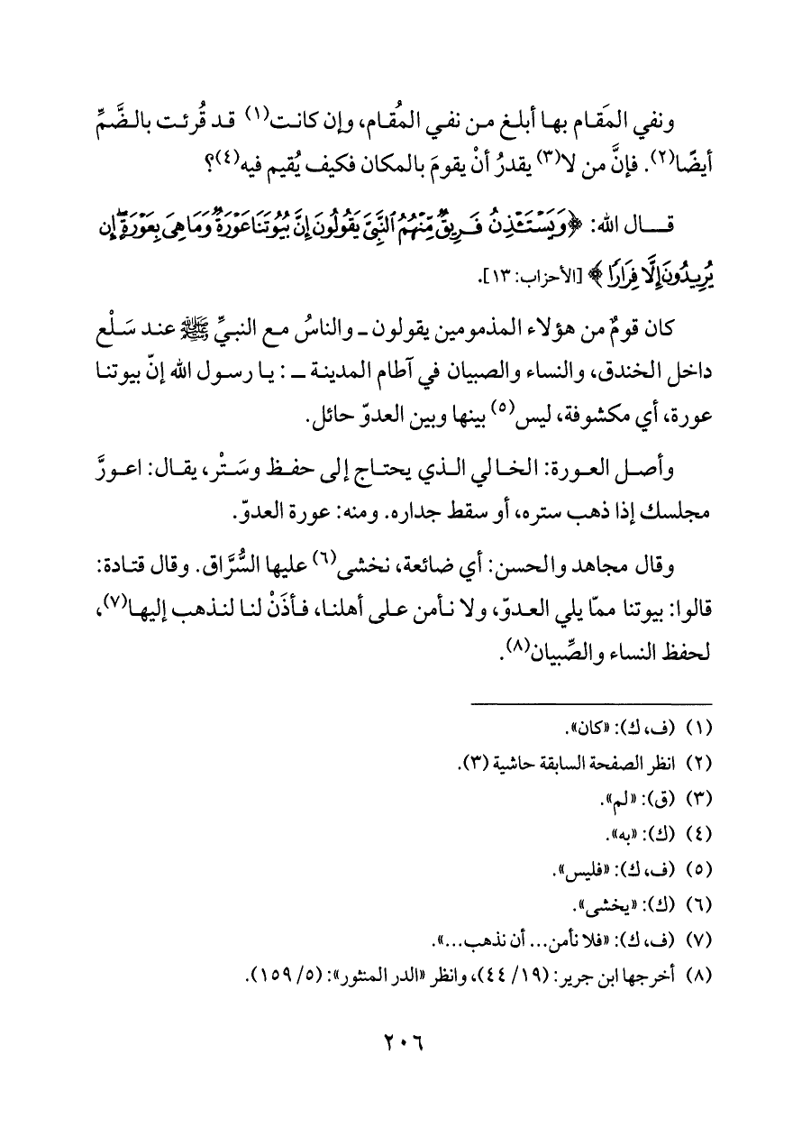 كان قومٌ من هؤلاء المذمومين يقولون ــ والناسُ مع النبيِّ - صلى الله عليه وسلم - عند سَلْع داخل الخندق، والنساء والصبيان في آطام المدينة ــ: يا رسول الله إنّ بيوتنا عورة، أي مكشوفة، ليس (¬٥) بينها وبين العدوّ حائل.