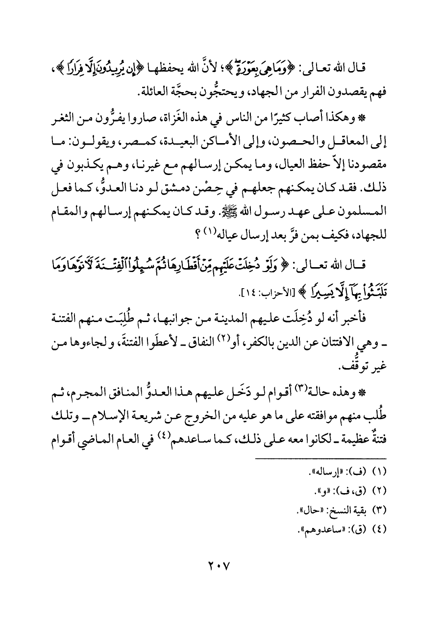 قال الله تعالى: {وَمَا هِيَ بِعَوْرَةٍ}؛ لأنَّ الله يحفظها {إِنْ يُرِيدُونَ إِلَّا فِرَارًا}، فهم يقصدون الفرار من الجهاد، ويحتجُّون بحجَّة العائلة.
