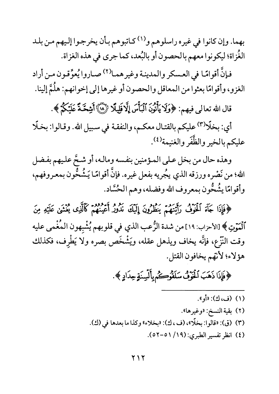قال الله تعالى فيهم: {وَلَا يَأْتُونَ الْبَأْسَ إِلَّا قَلِيلًا (١٨) أَشِحَّةً عَلَيْكُمْ}.