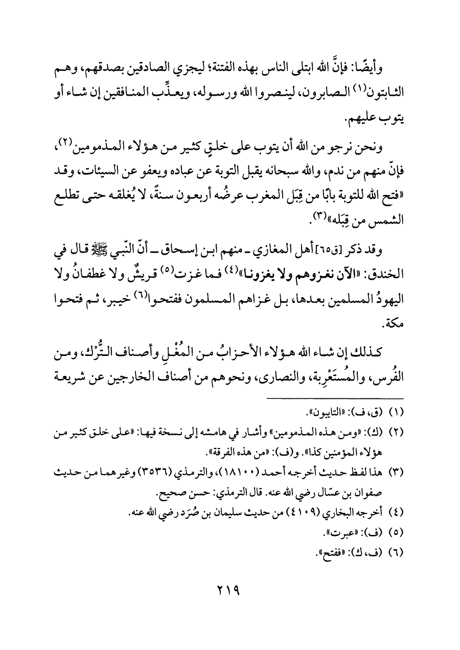 (¬٢) (ك): «ومن هذه المذمومين» وأشار في هامشه إلى نسخة فيها: «على خلق كثير من هؤلاء المؤمنين كذا». و (ف): «من هذه الفرقة».
