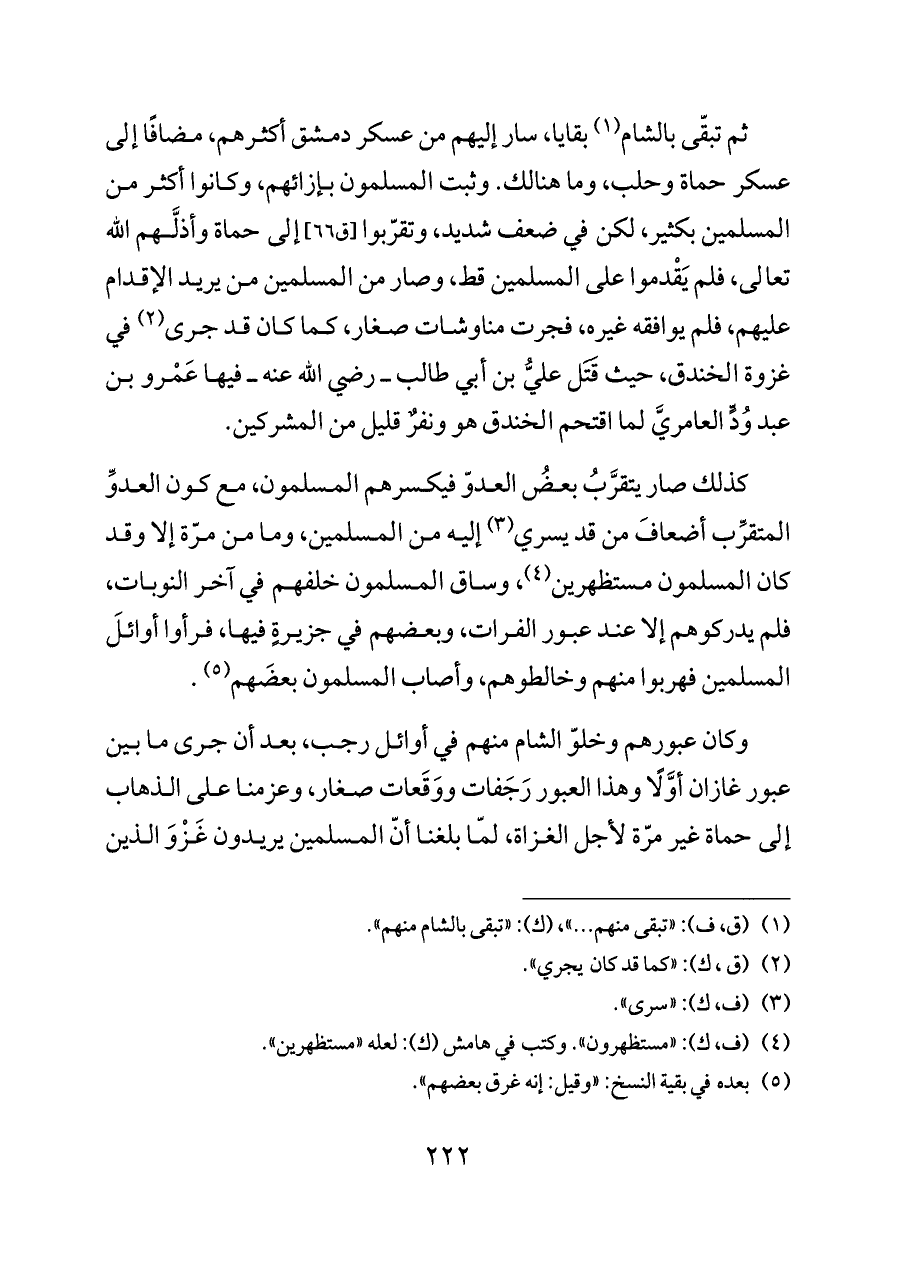 كذلك صار يتقرَّبُ بعضُ العدوّ فيكسرهم المسلمون، مع كون العدوِّ المتقرِّب أضعافَ من قد يسري (¬٣) إليه من المسلمين، وما من مرّة إلا وقد كان المسلمون مستظهرين (¬٤)، وساق المسلمون خلفهم في آخر النوبات، فلم يدركوهم إلا عند عبور الفرات، وبعضهم في جزيرةٍ فيها، فرأوا أوائلَ المسلمين فهربوا منهم وخالطوهم، وأصاب المسلمون بعضَهم (¬٥).