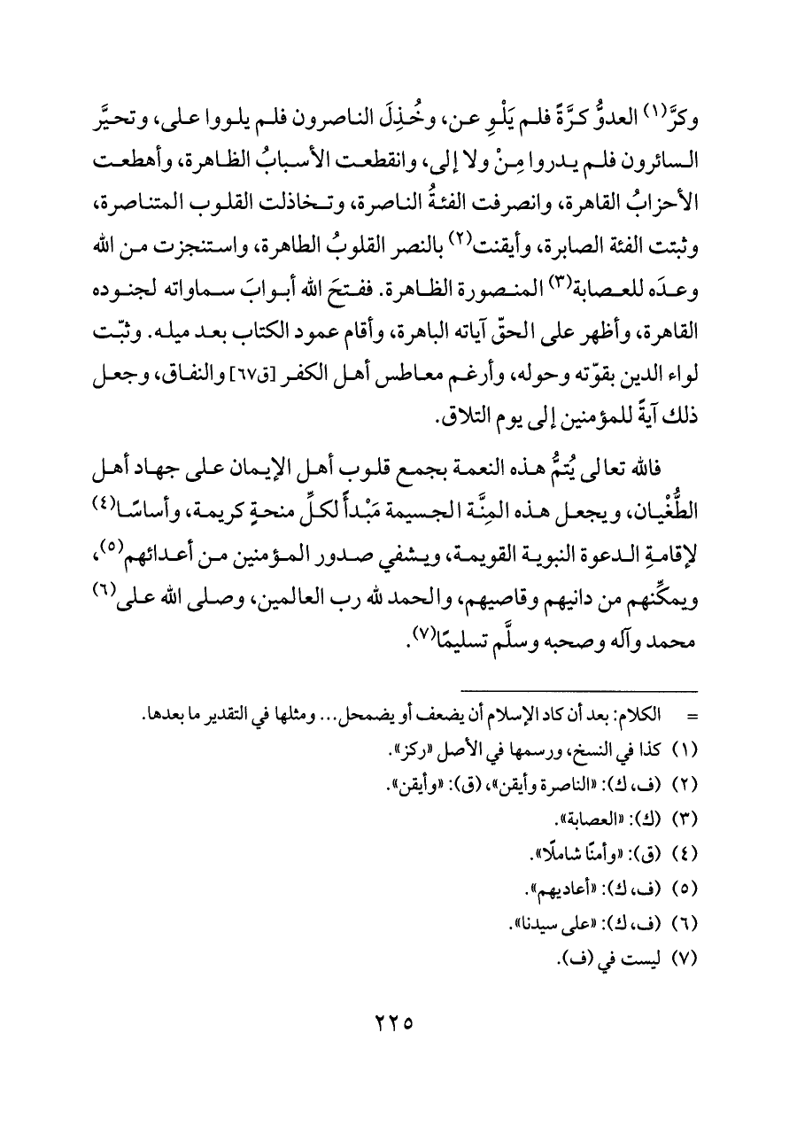 فالله تعالى يُتمُّ هذه النعمة بجمع قلوب أهل الإيمان على جهاد أهل الطُّغْيان، ويجعل هذه المِنَّة الجسيمة مَبْدأً لكلِّ منحةٍ كريمة، وأساسًا (¬٤) لإقامةِ الدعوة النبوية القويمة، ويشفي صدور المؤمنين من أعدائهم (¬٥)، ويمكِّنهم من دانيهم وقاصيهم، والحمد لله رب العالمين، وصلى الله على (¬٦) محمد وآله وصحبه وسلَّم تسليمًا (¬٧).
