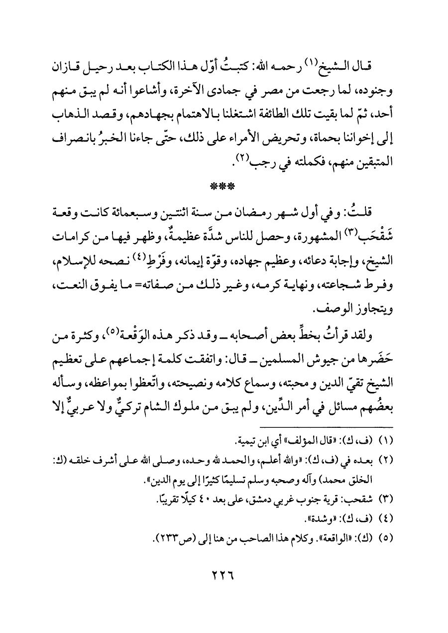 قال الشيخ (¬١) رحمه الله: كتبتُ أوّل هذا الكتاب بعد رحيل قازان وجنوده، لما رجعت من مصر في جمادى الآخرة، وأشاعوا أنه لم يبق منهم أحد، ثمّ لما بقيت تلك الطائفة اشتغلنا بالاهتمام بجهادهم، وقصد الذهاب إلى إخواننا بحماة، وتحريض الأمراء على ذلك، حتّى جاءنا الخبرُ بانصراف المتبقين منهم، فكملته في رجب (¬٢).