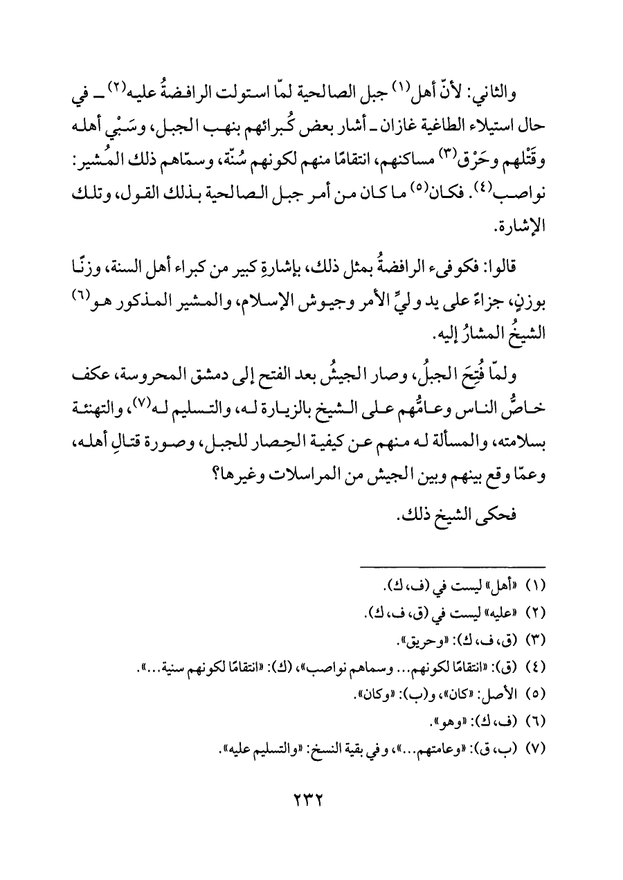 قالوا: فكوفئ الرافضةُ بمثل ذلك، بإشارةِ كبير من كبراء أهل السنة، وزنًا بوزنٍ، جزاءً على يد وليِّ الأمر وجيوش الإسلام، والمشير المذكور هو (¬٦) الشيخُ المشارُ إليه.