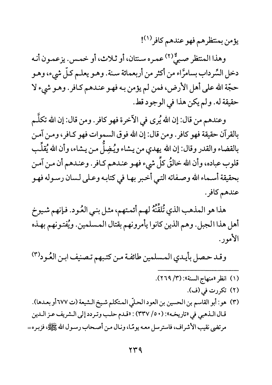 وهذا المنتظر صبيٌّ (¬٢) عمره سنتان، أو ثلاث، أو خمس. يزعمون أنه دخل السِّرداب بسامرَّاء من أكثر من أربعمائة سنة. وهو يعلم كلّ شيء، وهو حجّة الله على أهل الأرض، فمن لم يؤمن به فهو عندهم كافر. وهو شيء لا حقيقة له. ولم يكن هذا في الوجود قط.