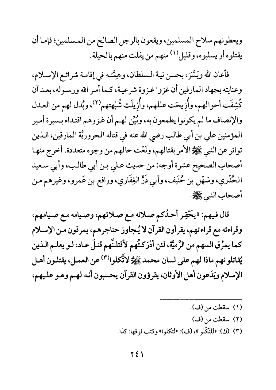 فأعان الله ويَسَّرَ، بحسن نية السلطان، وهِمَّته في إقامة شرائع الإسلام، وعنايته بجهاد المارقين أن غزوا غزوة شرعية، كما أمر الله ورسوله، بعد أن كُشِفَت أحوالهم، وأُزِيحَت عللهم، وأُزِيلَت شُبْهتهم (¬٢)، وبُذل لهم من العدل والإنصاف ما لم يكونوا يطمعون به، وبُيِّن لهم أن غزوهم اقتداء بسيرة أمير المؤمنين علي بن أبي طالب رضي الله عنه في قتاله الحروريَّة المارقين، الذين تواتر عن النبي - صلى الله عليه وسلم - الأمر بقتالهم، ونَعْت حالهم من وجوه متعددة. أخرج منها أصحاب الصحيح عشرة أوجه: من حديث علي بن أبي طالب، وأبي سعيد الخُدْري، وسَهْل بن حُنَيف، وأبي ذَرٍّ الغِفَاري، ورافع بن عَمرو، وغيرهم من أصحاب النبي - صلى الله عليه وسلم - .
