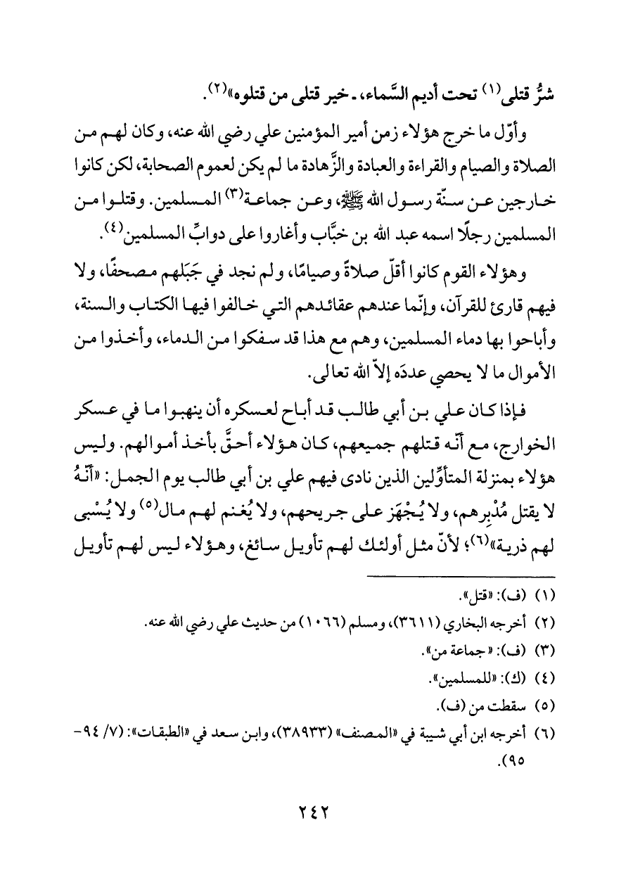 وأوّل ما خرج هؤلاء زمن أمير المؤمنين علي رضي الله عنه، وكان لهم من الصلاة والصيام والقراءة والعبادة والزَّهادة ما لم يكن لعموم الصحابة، لكن كانوا خارجين عن سنّة رسول الله - صلى الله عليه وسلم - ، وعن جماعة (¬٣) المسلمين. وقتلوا من المسلمين رجلًا اسمه عبد الله بن خبَّاب وأغاروا على دوابِّ المسلمين (¬٤).