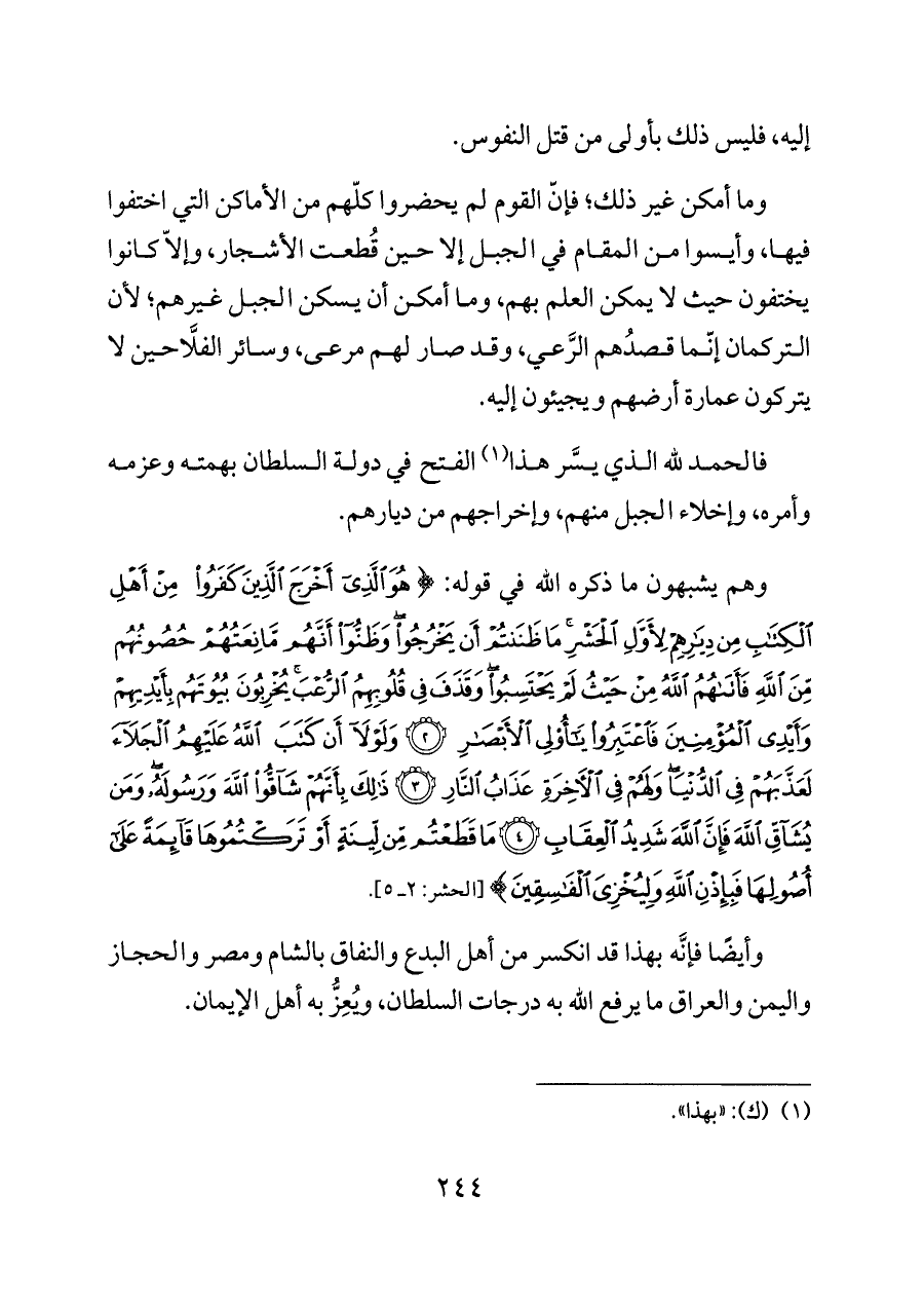 فالحمد لله الذي يسَّر هذا (¬١) الفتح في دولة السلطان بهمته وعزمه وأمره، وإخلاء الجبل منهم، وإخراجهم من ديارهم.