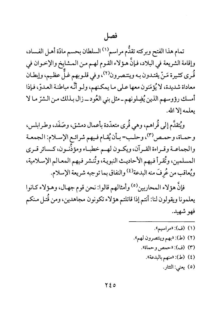 تمام هذا الفتح وبركته تقدُّم مراسم (¬١) السلطان بحسم مادّة أهل الفساد، وإقامة الشريعة في البلاد، فإنَّ هؤلاء القوم لهم من المشايخ والإخوان في قُرى كثيرة مَنْ يقتدون به وينتصرون (¬٢)، وفي قلوبهم غلٌّ عظيم، وإبطان معاداة شديدة، لا يُؤمَنون معها على ما يمكنهم، ولو أنَّه مباطنة العدوّ، فإذا أمسك رؤوسهم الذين يُضِلونهم ــ مثل بني العُود ــ زال بذلك من الشرّ ما لا يعلمه إلا الله.