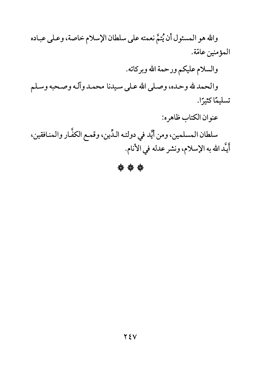 والله هو المسئول أن يُتمَّ نعمته على سلطان الإسلام خاصة، وعلى عباده المؤمنين عامّة.