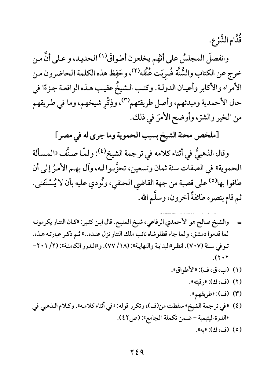 وانفصلَ المجلسُ على أنَّهم يخلعون أطواقَ (¬١) الحديد، وعلى أنَّ من خرج عن الكتاب والسُّنَّة ضُرِبَت عُنُقه (¬٢)، وحَفِظ هذه الكلمة الحاضرون من الأمراء والأكابر وأعيان الدولة. وكتب الشيخُ عقيب هذه الواقعة جزءًا في حال الأحمدية ومبدئهم، وأصل طريقتهم (¬٣)، وذِكْرِ شيخهم، وما في طريقهم من الخير والشرّ، وأوضح الأمرَ في ذلك.