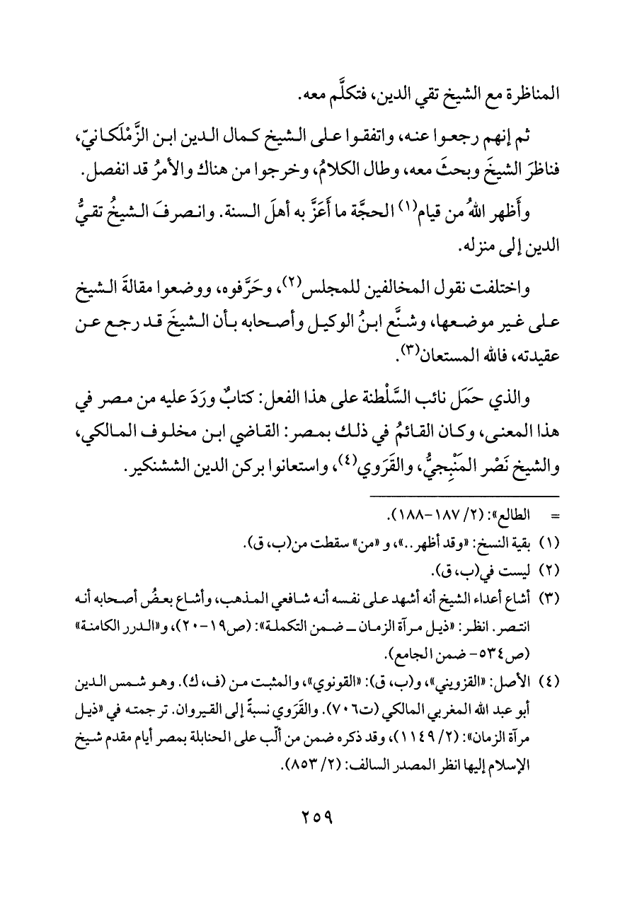 (¬٤) الأصل: «القزويني»، و (ب، ق): «القونوي»، والمثبت من (ف، ك). وهو شمس الدين أبو عبد الله المغربي المالكي (ت ٧٠٦). والقَرَوي نسبةً إلى القيروان. ترجمته في «ذيل مرآة الزمان»: (٢/ ١١٤٩)، وقد ذكره ضمن من ألّب على الحنابلة بمصر أيام مقدم شيخ الإسلام إليها انظر المصدر السالف: (٢/ ٨٥٣).