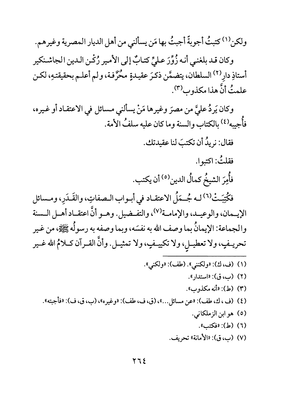 فكُتِبَتْ (¬٦) له جُمَلُ الاعتقاد في أبواب الصفاتِ، والقَدَرِ، ومسائل الإيمان، والوعيد، والإمامة (¬٧)، والتفضيل. وهو أنَّ اعتقاد أهل السنة والجماعة: الإيمانُ بما وصف الله به نفسَه، وبما وصفه به رسولُه - صلى الله عليه وسلم - ، من غير تحريفٍ، ولا تعطيلٍ، ولا تكييفٍ، ولا تمثيل. وأنَّ القرآن كلامُ الله غير