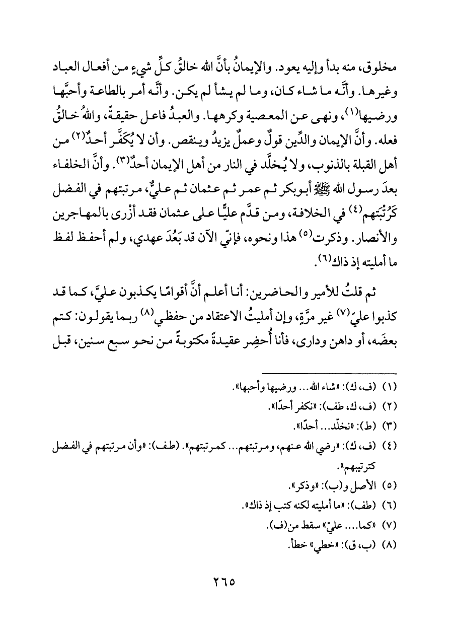 مخلوق، منه بدأ وإليه يعود. والإيمانُ بأنَّ الله خالقُ كلِّ شيءٍ من أفعال العباد وغيرها. وأنَّه ما شاء كان، وما لم يشأ لم يكن. وأنَّه أمر بالطاعة وأحبَّها ورضيها (¬١)، ونهى عن المعصية وكرهها. والعبدُ فاعل حقيقةً، واللهُ خالقُ فعله. وأنَّ الإيمان والدِّين قولٌ وعملٌ يزيدُ وينقص. وأن لا يُكَفَّر أحدٌ (¬٢) من أهل القبلة بالذنوب، ولا يُخلَّد في النار من أهل الإيمان أحدٌ (¬٣). وأنَّ الخلفاء بعدَ رسول الله - صلى الله عليه وسلم - أبوبكر ثم عمر ثم عثمان ثم عليٌّ، مرتبتهم في الفضل كَرُتْبَتهم (¬٤) في الخلافة، ومن قدَّم عليًّا على عثمان فقد أزْرى بالمهاجرين والأنصار. وذكرت (¬٥) هذا ونحوه، فإنّي الآن قد بَعُدَ عهدي، ولم أحفظ لفظ ما أمليته إذ ذاك (¬٦).