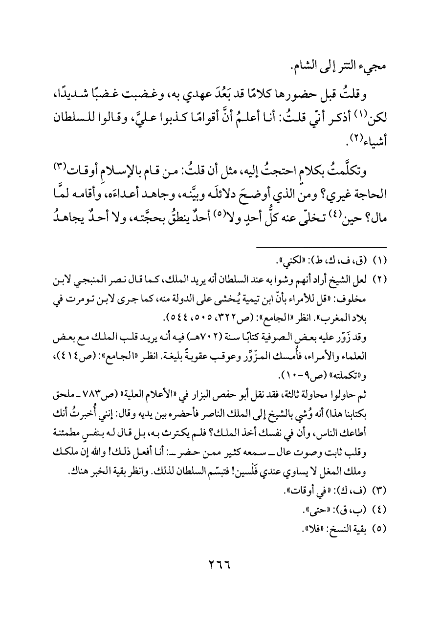 (¬٢) لعل الشيخ أراد أنهم وشوا به عند السلطان أنه يريد الملك، كما قال نصر المنبجي لابن مخلوف: «قل للأمراء بأنّ ابن تيمية يُخشى على الدولة منه، كما جرى لابن تومرت في بلاد المغرب». انظر «الجامع»: (ص ٣٢٢، ٥٠٥، ٥٤٤).