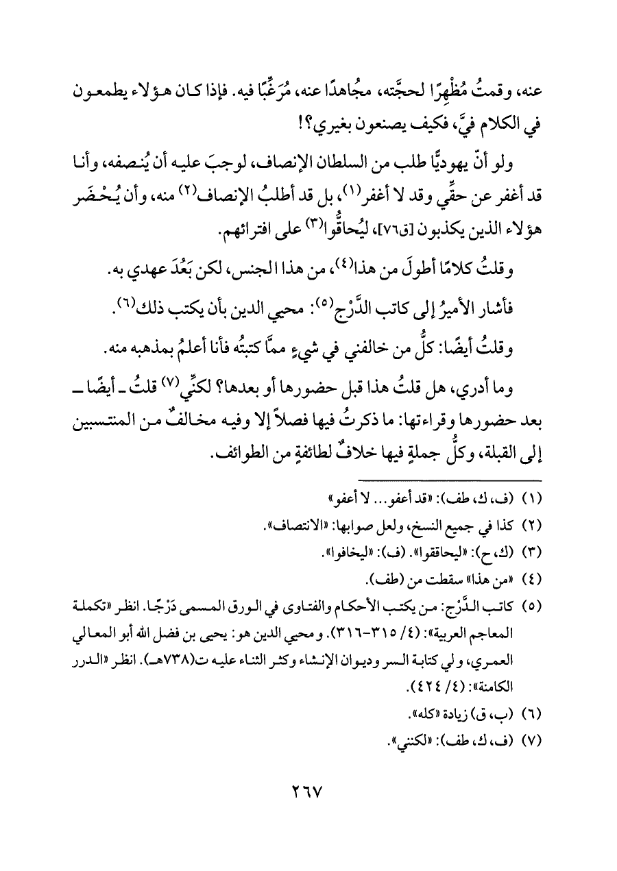 ولو أنّ يهوديًّا طلب من السلطان الإنصاف، لوجبَ عليه أن يُنصفه، وأنا قد أغفر عن حقِّي وقد لا أغفر (¬١)، بل قد أطلبُ الإنصاف (¬٢) منه، وأن يُحْضَر هؤلاء الذين يكذبون [ق ٧٦]، ليُحاقُّوا (¬٣) على افترائهم.