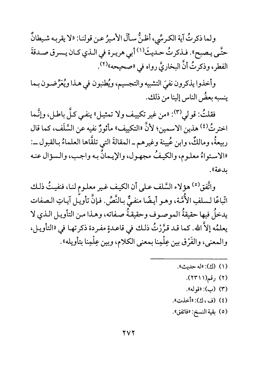 واتَّفق (¬٥) هؤلاء السَّلف على أن الكيف غير معلومٍ لنا، فنفيتُ ذلك اتّباعًا لسلفِ الأُمَّة، وهو أيضًا منفيٌّ بالنَّصِّ. فإنَّ تأويل آياتِ الصفات يدخلُ فيها حقيقةُ الموصوف وحقيقةُ صفاته، وهذا من التأويل الذي لا يعلمُه إلَاّ الله. كما قد قرَّرْتُ ذلك في قاعدةٍ مفردة ذكرتها في «التأويل، والمعنى، والفَرْق بين عِلْمِنا بمعنى الكلام، وبين عِلْمِنا بتأويله».