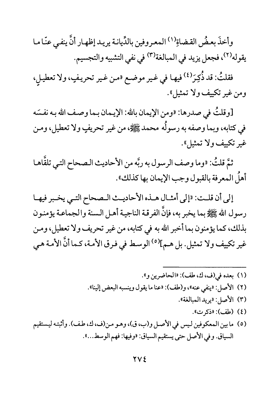 إلى أن قلت: «إلى أمثال هذه الأحاديث الصحاح التي يخبر فيها رسول الله - صلى الله عليه وسلم - بما يخبر به، فإنَّ الفرقة الناجية أهل السنة والجماعة يؤمنون بذلك، كما يؤمنون بما أخبر الله به في كتابه، من غير تحريف ولا تعطيل، ومن غير تكييف ولا تمثيل. بل هم] (¬٥) الوسط في فرق الأمة، كما أنَّ الأمة هي