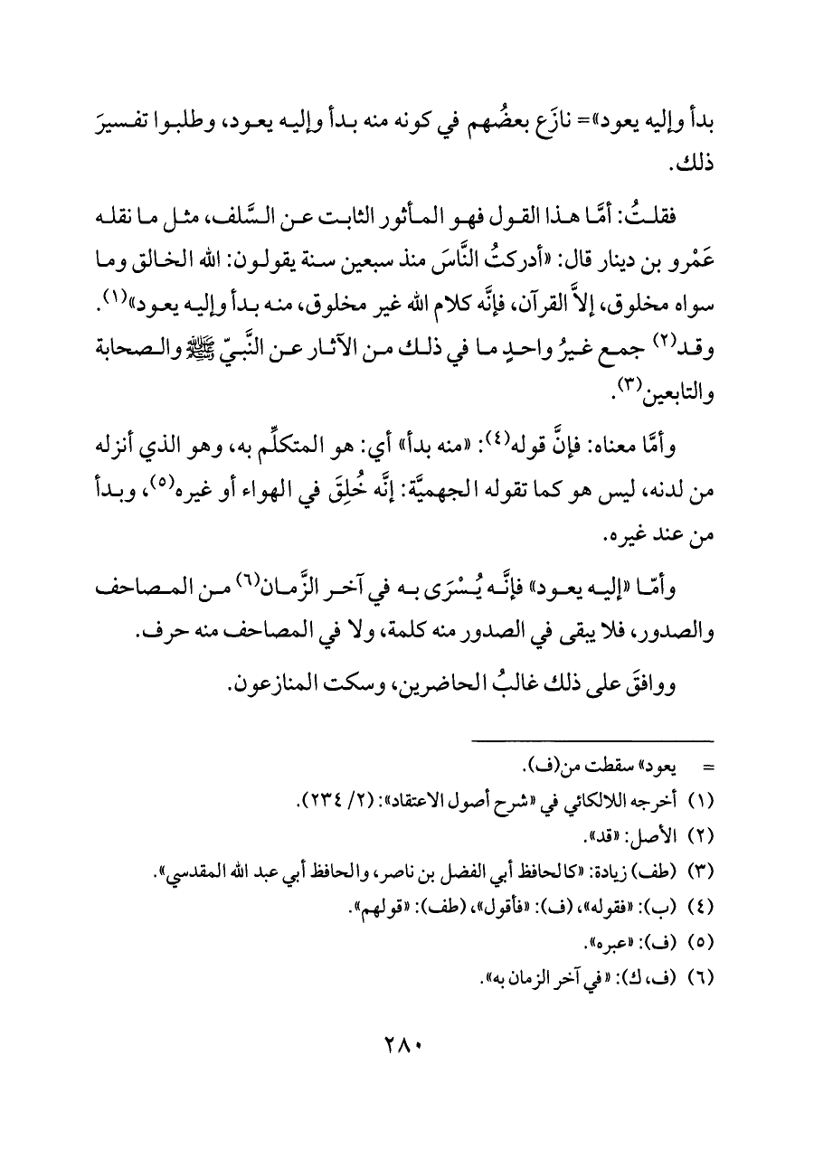 فقلتُ: أمَّا هذا القول فهو المأثور الثابت عن السَّلف، مثل ما نقله عَمْرو بن دينار قال: «أدركتُ النَّاسَ منذ سبعين سنة يقولون: الله الخالق وما سواه مخلوق، إلَاّ القرآن، فإنَّه كلام الله غير مخلوق، منه بدأ وإليه يعود» (¬١). وقد (¬٢) جمع غيرُ واحدٍ ما في ذلك من الآثار عن النَّبيّ - صلى الله عليه وسلم - والصحابة والتابعين (¬٣).