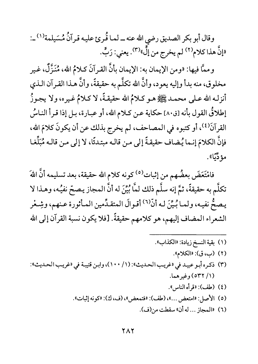 فامْتَعَضَ بعضُهم من إثبات (¬٥) كونه كلام الله حقيقة، بعد تسليمه أنَّ اللهَ تكلَّم به حقيقةً، ثمَّ إنه سلَّم ذلك لمَّا بُيِّنَ له أنَّ المجاز يصحّ نفيُه، وهذا لا يصحُّ نفيه، ولما بُيِّنَ له أنّ (¬٦) أقوالَ المتقدِّمين المأثورة عنهم، وشِعْر الشعراء المضاف إليهم، هو كلامهم حقيقةً. [فلا يكون نسبة القرآن إلى الله