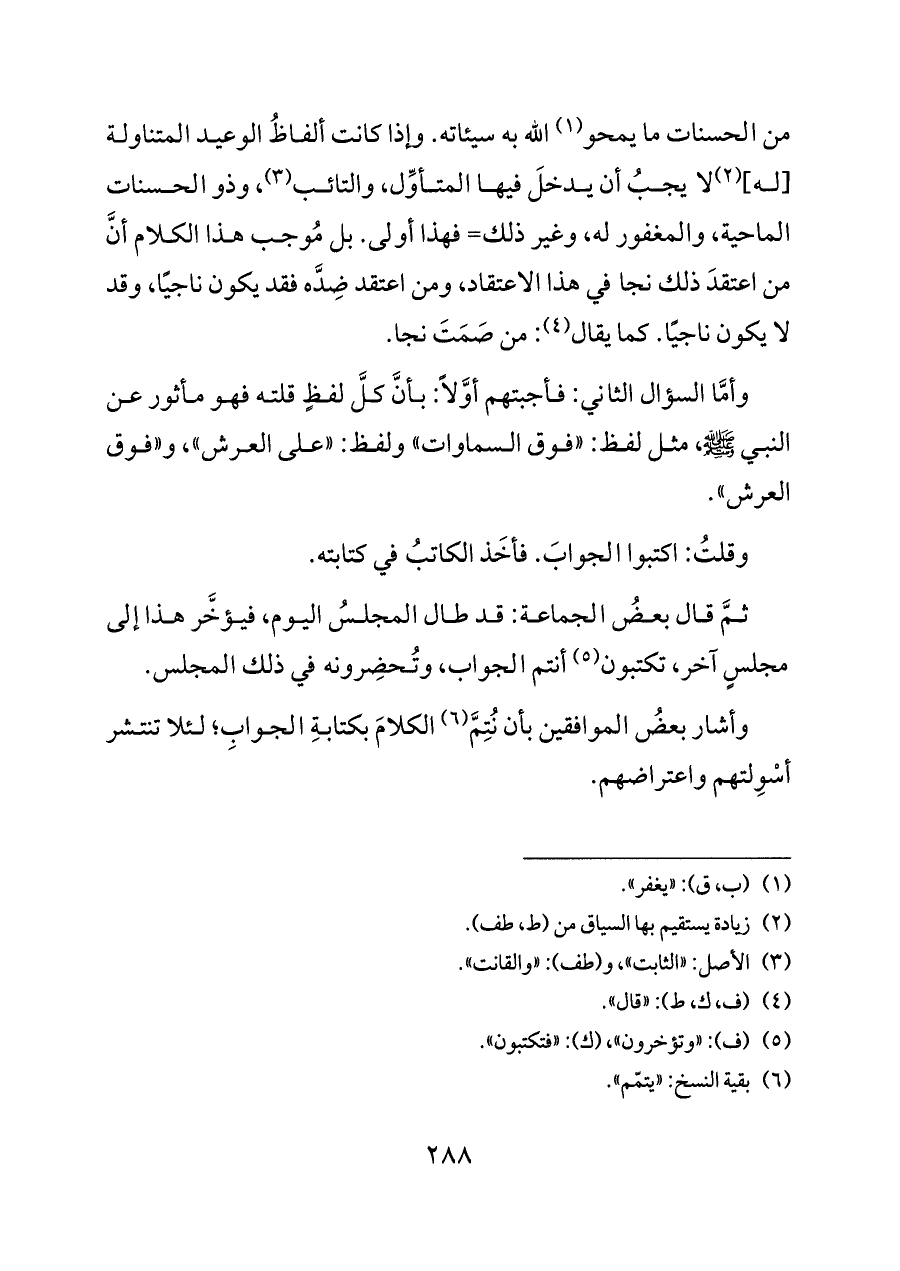 وأمَّا السؤال الثاني: فأجبتهم أوَّلاً: بأنَّ كلَّ لفظٍ قلته فهو مأثور عن النبي - صلى الله عليه وسلم - ، مثل لفظ: «فوق السماوات» ولفظ: «على العرش»، و «فوق العرش».