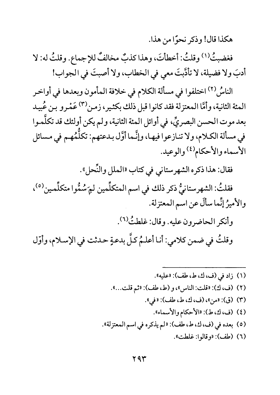 فقلتُ: الشهرستانيُّ ذكر ذلك في اسم المتكلِّمين لِمَ سُمُّوا متكلِّمين (¬٥)، والأميرُ إنِّما سألَ عن اسم المعتزلة.