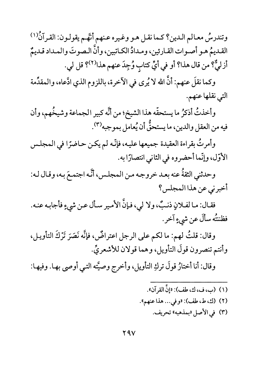 وقال: قلتُ لهم: ما لكم على الرجل اعتراضٌ، فإنَّه نَصَرَ تَرْكَ التأويل، وأنتم تنصرون قولَ التأويل، وهما قولان للأشعريِّ.