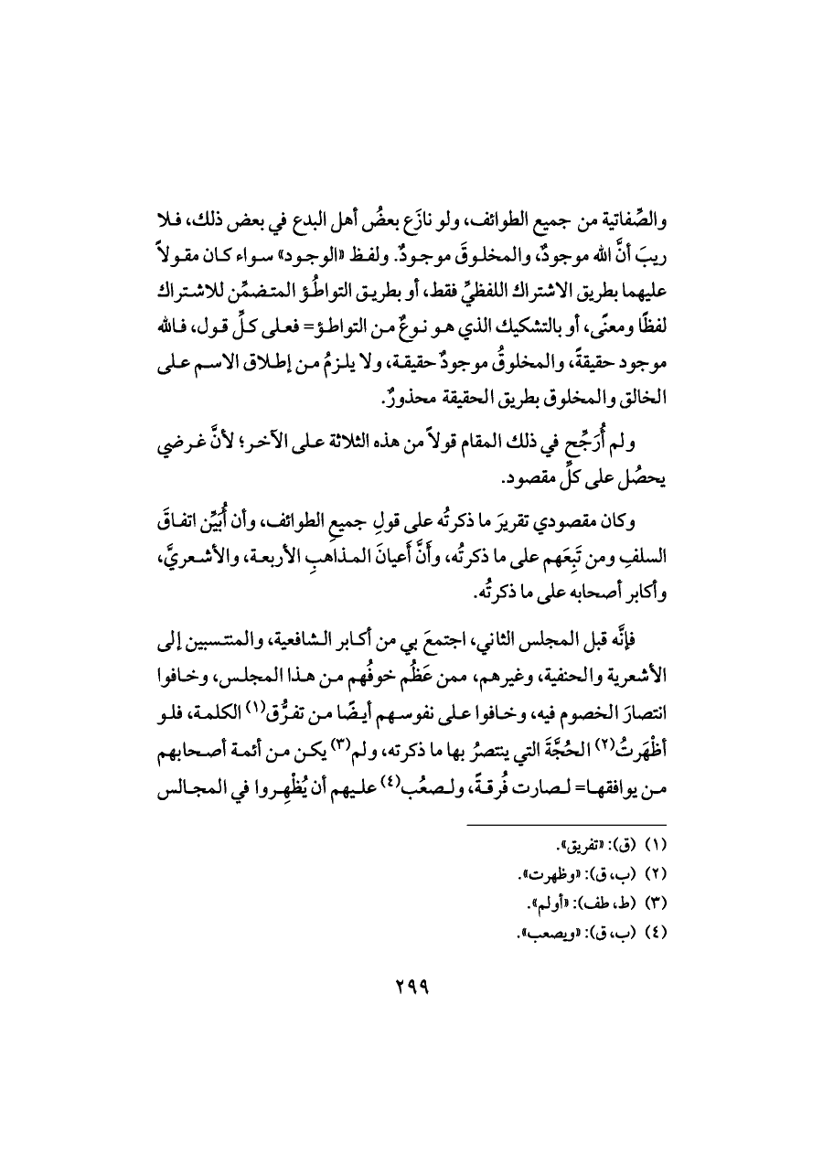 فإنَّه قبل المجلس الثاني، اجتمعَ بي من أكابر الشافعية، والمنتسبين إلى الأشعرية والحنفية، وغيرهم، ممن عَظُم خوفُهم من هذا المجلس، وخافوا انتصارَ الخصوم فيه، وخافوا على نفوسهم أيضًا من تفرُّق (¬١) الكلمة، فلو أظْهَرتُ (¬٢) الحُجَّةَ التي ينتصرُ بها ما ذكرته، ولم (¬٣) يكن من أئمة أصحابهم من يوافقها= لصارت فُرقةً، ولصعُب (¬٤) عليهم أن يُظْهِروا في المجالس