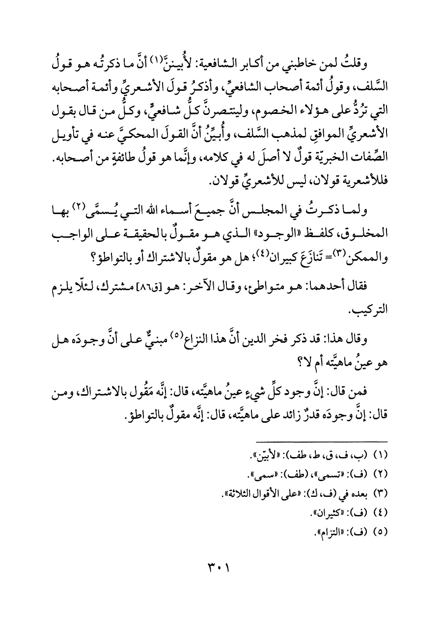 فمن قال: إنَّ وجود كلِّ شيءٍ عينُ ماهيَّته، قال: إنَّه مَقُول بالاشتراك، ومن قال: إنَّ وجودَه قدرٌ زائد على ماهيَّته، قال: إنَّه مقولٌ بالتواطؤ.