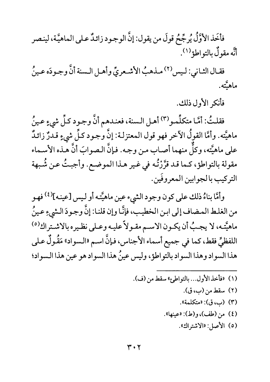 فأخَذ الأوَّلُ يُرجِّحُ قولَ من يقول: إنَّ الوجود زائدٌ على الماهيَّة، لينصر أنَّه مقولٌ بالتواطؤ (¬١).