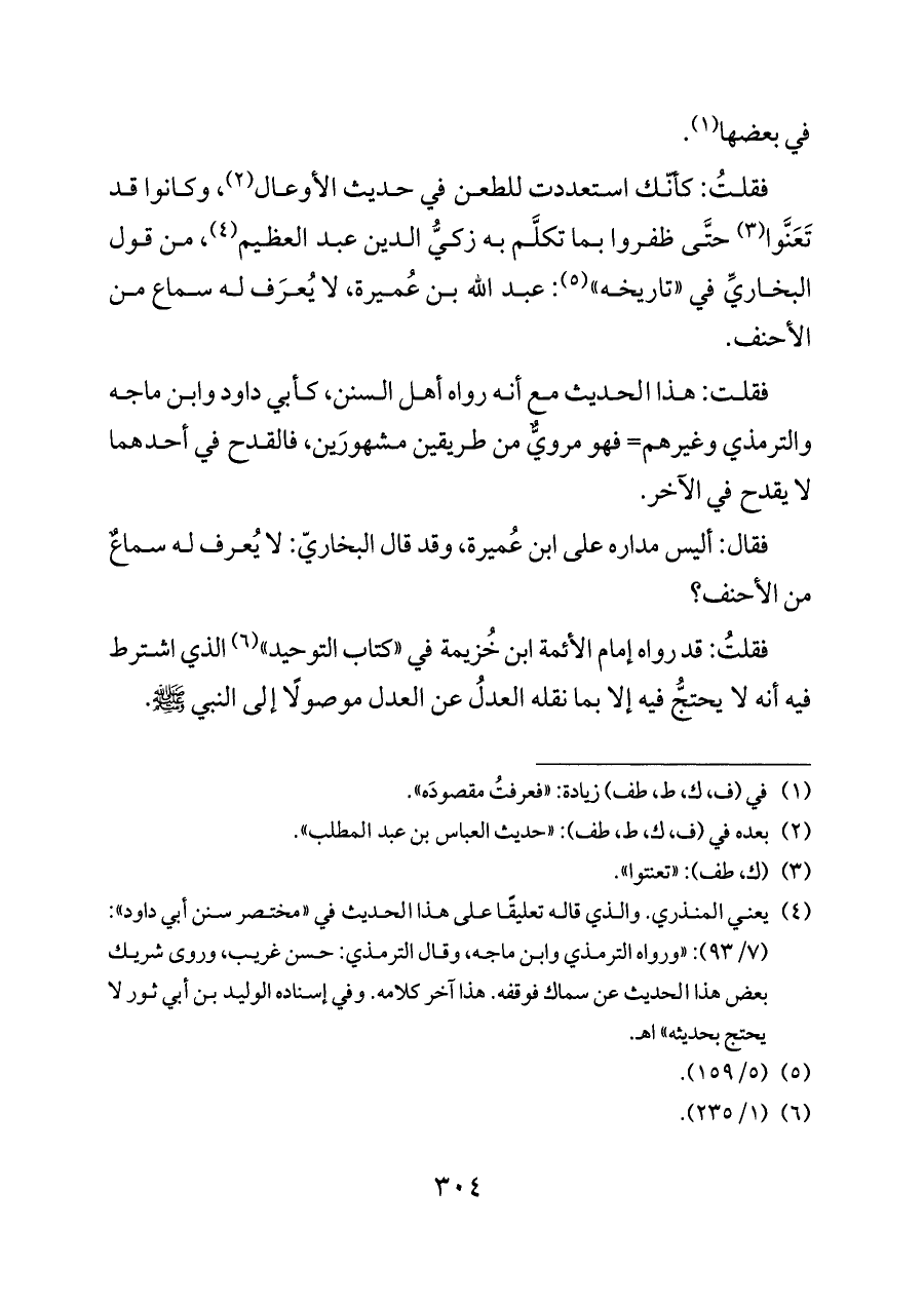فقلتُ: كأنّك استعددت للطعن في حديث الأوعال (¬٢)، وكانوا قد تَعَنَّوا (¬٣) حتَّى ظفروا بما تكلَّم به زكيُّ الدين عبد العظيم (¬٤)، من قول البخاريِّ في «تاريخه» (¬٥): عبد الله بن عُميرة، لا يُعرَف له سماع من الأحنف.