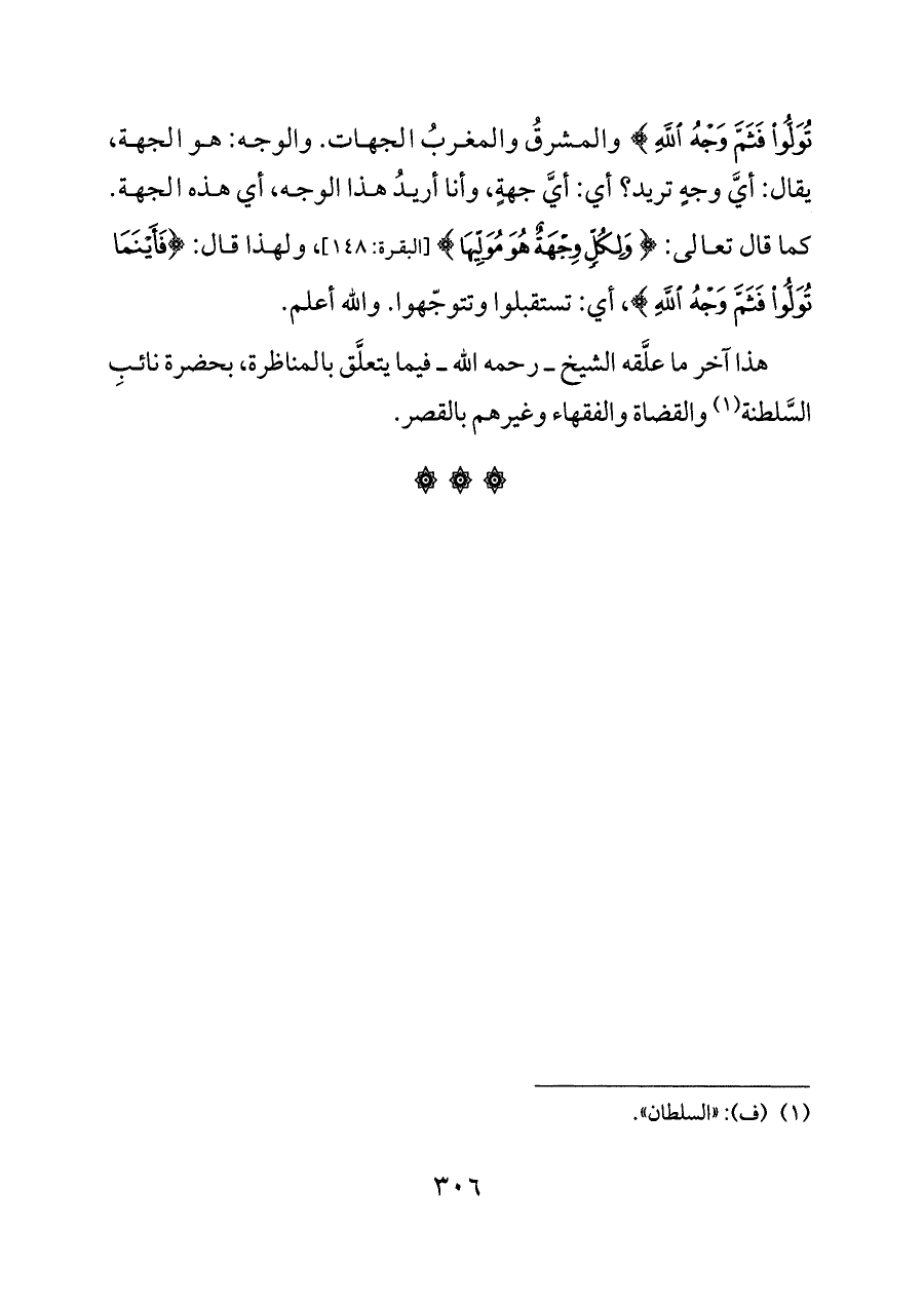 تُوَلُّوا فَثَمَّ وَجْهُ اللَّهِ} والمشرقُ والمغربُ الجهات. والوجه: هو الجهة، يقال: أيَّ وجهٍ تريد؟ أي: أيَّ جهةٍ، وأنا أريدُ هذا الوجه، أي هذه الجهة. كما قال تعالى: {وَلِكُلٍّ وِجْهَةٌ هُوَ مُوَلِّيهَا} [البقرة: ١٤٨]، ولهذا قال: {فَأَيْنَمَا تُوَلُّوا فَثَمَّ وَجْهُ اللَّهِ}، أي: تستقبلوا وتتوجّهوا. والله أعلم.