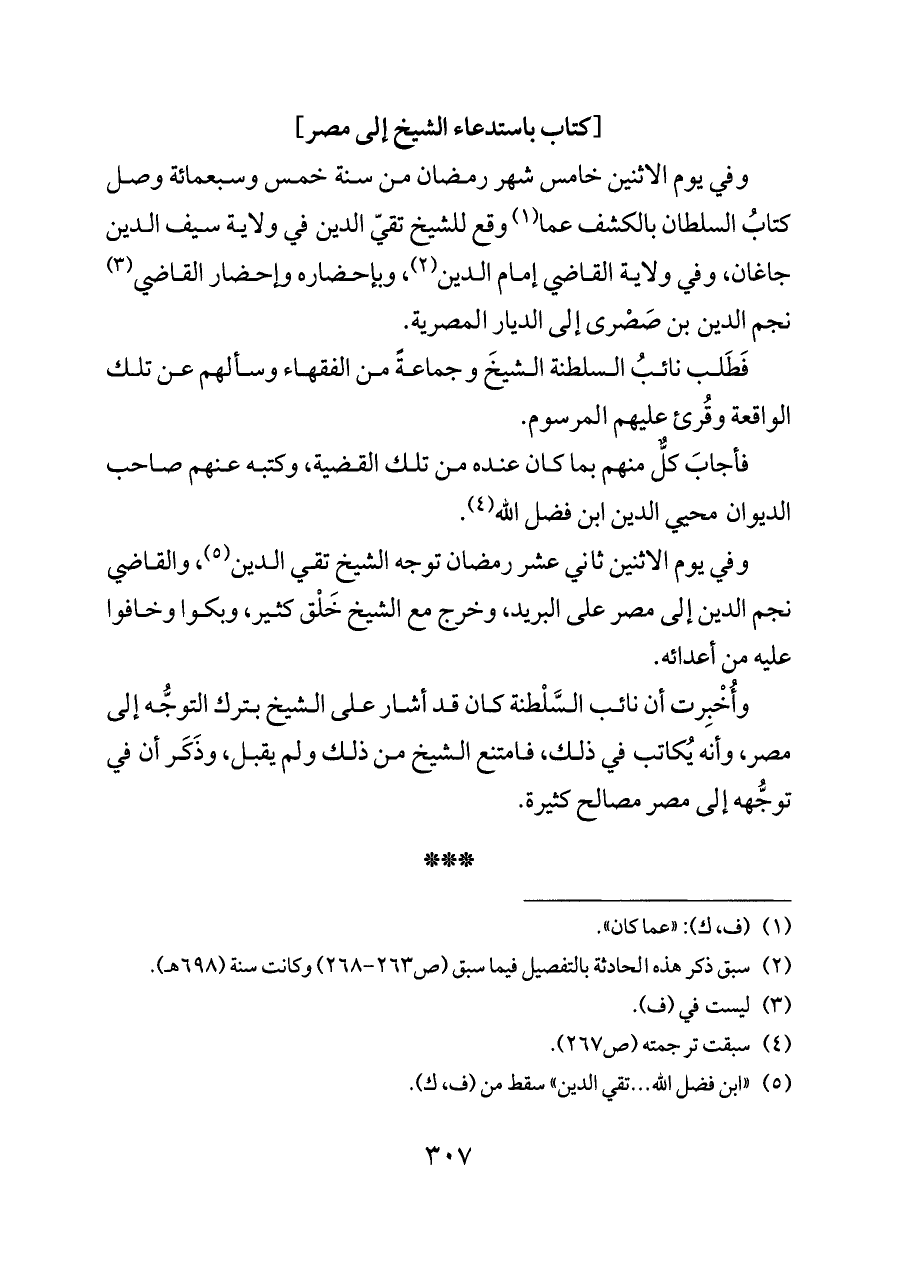 وفي يوم الاثنين خامس شهر رمضان من سنة خمس وسبعمائة وصل كتابُ السلطان بالكشف عما (¬١) وقع للشيخ تقيّ الدين في ولاية سيف الدين جاغان، وفي ولاية القاضي إمام الدين (¬٢)، وبإحضاره وإحضار القاضي (¬٣) نجم الدين بن صَصْرى إلى الديار المصرية.