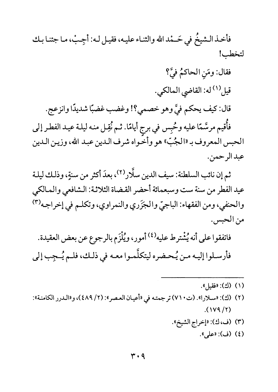 ثم إن نائب السلطنة: سيف الدين سلَّار (¬٢)، بعدَ أكثر من سنةٍ، وذلك ليلة عيد الفطر من سنة ست وسبعمائة أحضر القضاة الثلاثة: الشافعي والمالكي والحنفي، ومن الفقهاء: الباجيّ والجَزَري والنمراوي، وتكلم في إخراجه (¬٣) من الحبس.