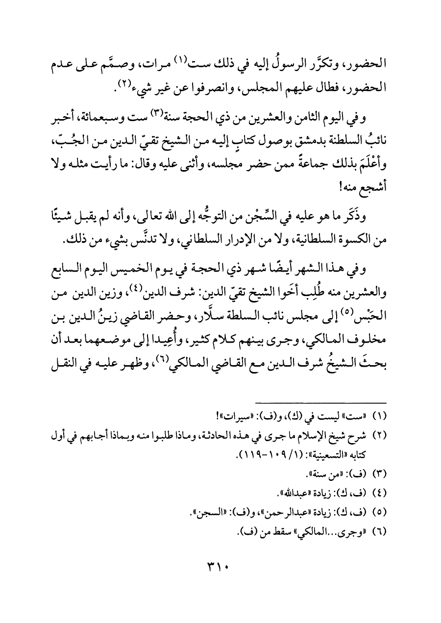 وفي هذا الشهر أيضًا شهر ذي الحجة في يوم الخميس اليوم السابع والعشرين منه طُلِب أخَوا الشيخ تقيّ الدين: شرف الدين (¬٤)، وزين الدين من الحَبْس (¬٥) إلى مجلس نائب السلطة سلَّار، وحضر القاضي زينُ الدين بن مخلوف المالكي، وجرى بينهم كلام كثير، وأُعِيدا إلى موضعهما بعد أن بحثَ الشيخُ شرف الدين مع القاضي المالكي (¬٦)، وظهر عليه في النقل