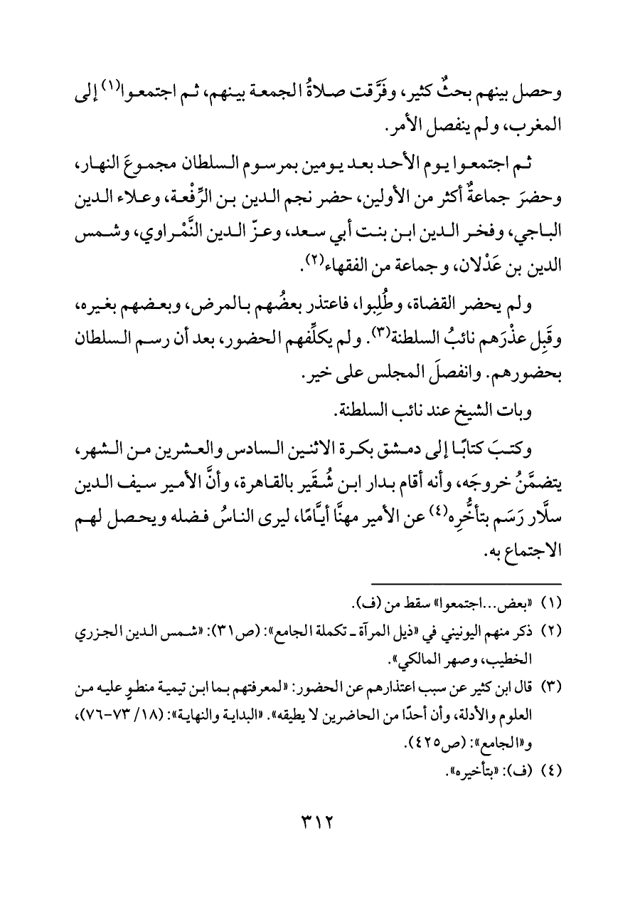 (¬٣) قال ابن كثير عن سبب اعتذارهم عن الحضور: «لمعرفتهم بما ابن تيمية منطوٍ عليه من العلوم والأدلة، وأن أحدًا من الحاضرين لا يطيقه». «البداية والنهاية»: (١٨/ ٧٣ - ٧٦)، و «الجامع»: (ص ٤٢٥).