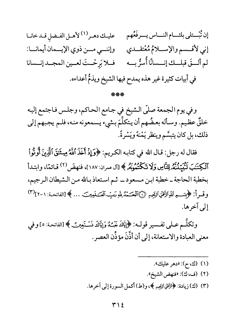 فقال له رجل: قال الله في كتابه الكريم: {وَإِذْ أَخَذَ اللَّهُ مِيثَاقَ الَّذِينَ أُوتُوا الْكِتَابَ لَتُبَيِّنُنَّهُ لِلنَّاسِ وَلَا تَكْتُمُونَهُ} [آل عمران: ١٨٧]، فنهضَ (¬٢) قائمًا، وابتدأ بخطبة الحاجة ــ خطبة ابن مسعود ــ ثم استعاذ بالله من الشيطان الرجيم، وقرأ: {بِسْمِ اللَّهِ الرَّحْمَنِ الرَّحِيمِ (١) الْحَمْدُ لِلَّهِ رَبِّ الْعَالَمِينَ ... } [الفاتحة: ١ - ٢] (¬٣) إلى آخرها.