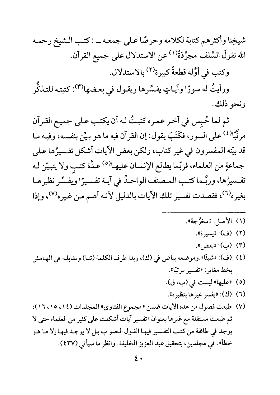 ثم لما حُبِس في آخر عمره كتبتُ له أن يكتب على جميع القرآن مرتَّبًا (¬٤) على السور، فكَتَبَ يقول: إن القرآن فيه ما هو بيِّن بنفسه، وفيه ما قد بيّنه المفسرون في غير كتاب، ولكن بعض الآيات أشكل تفسيرُها على جماعةٍ من العلماء، فربّما يطالع الإنسان عليها (¬٥) عدَّة كتبٍ ولا يتبيّن له تفسيرُها، وربَّما كتب المصنف الواحدُ في آية تفسيرًا ويفسِّر نظيرها بغيره (¬٦)، فقصدت تفسير تلك الآيات بالدليل لأنه أهم من غيره (¬٧)، وإذا